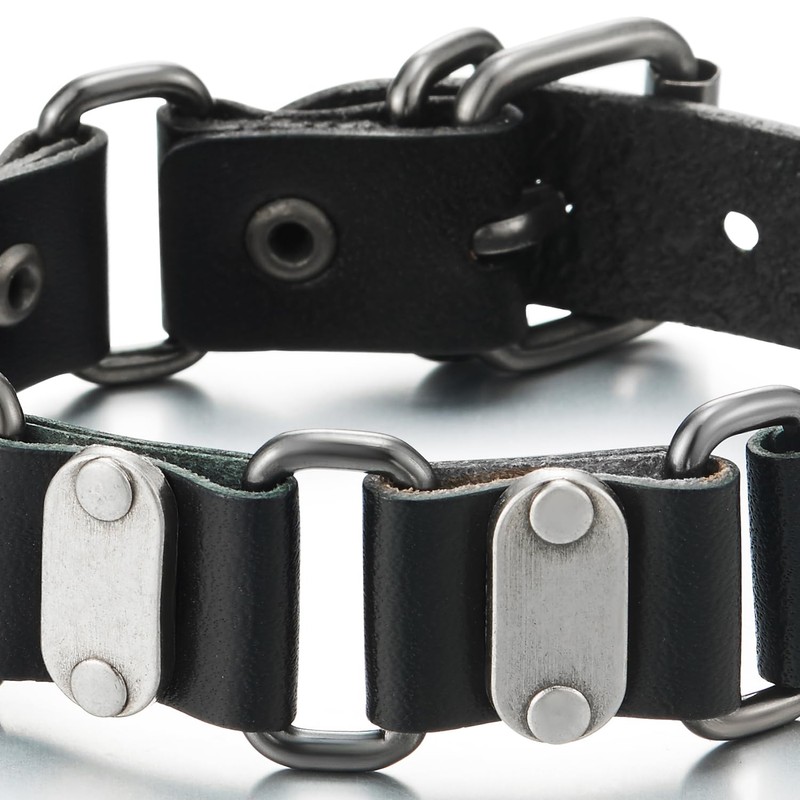 COOLSTEELANDBEYOND Men's Leather Link Chain Bracelet, Black Leather Bangle Bracelet, Sweatband with Metal and Rivets Charm, Black leather, No gemstone