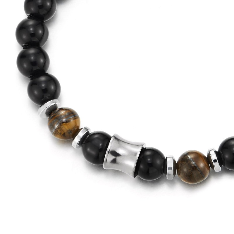 COOLSTEELANDBEYOND Mens Black Beads Bracelet with Tiger Eye Accents and Silver Metal Centerpiece, Stretchable, Length 6.69-7.87", Width 0.31", Synthetic Black Onyx and Tigereye Stone, no gemstone