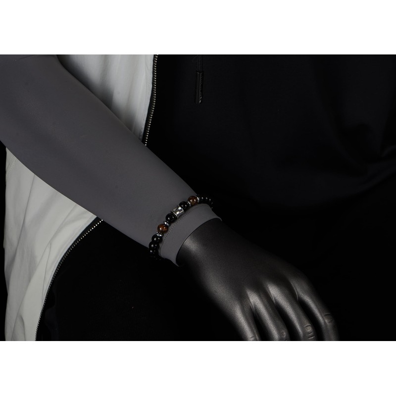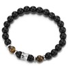 - Mens Black Beads Bracelet with Tiger Eye Accents and Silver Metal Centerpiece, Stretchable