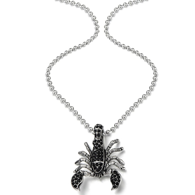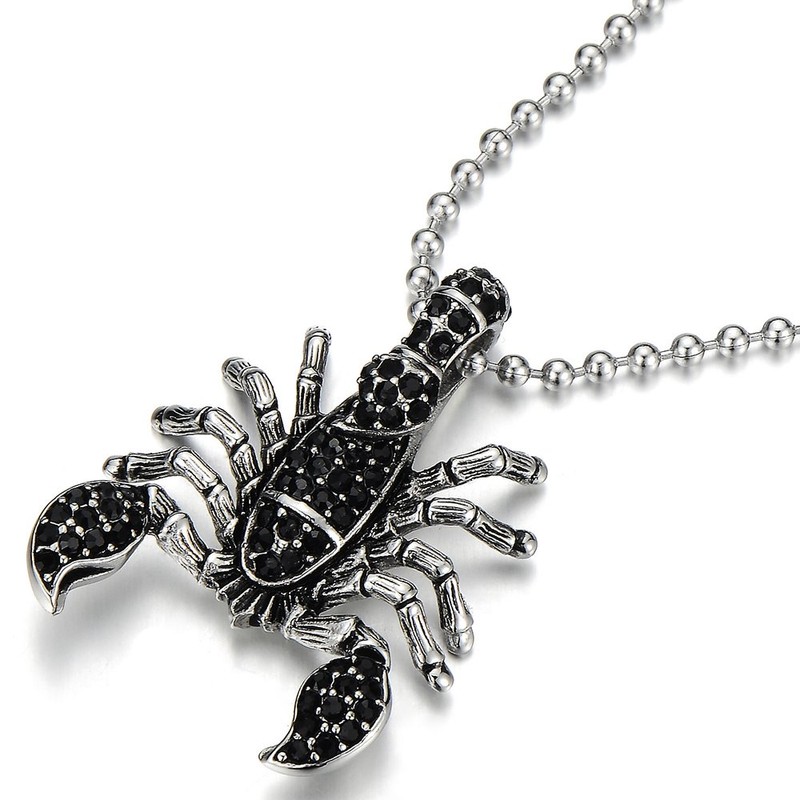 COOLSTEELANDBEYOND Mens Steel Scorpion Pendant Necklace with Black Cubic Zirconia Gothic Style with 23.6 in Ball Chain(CA)