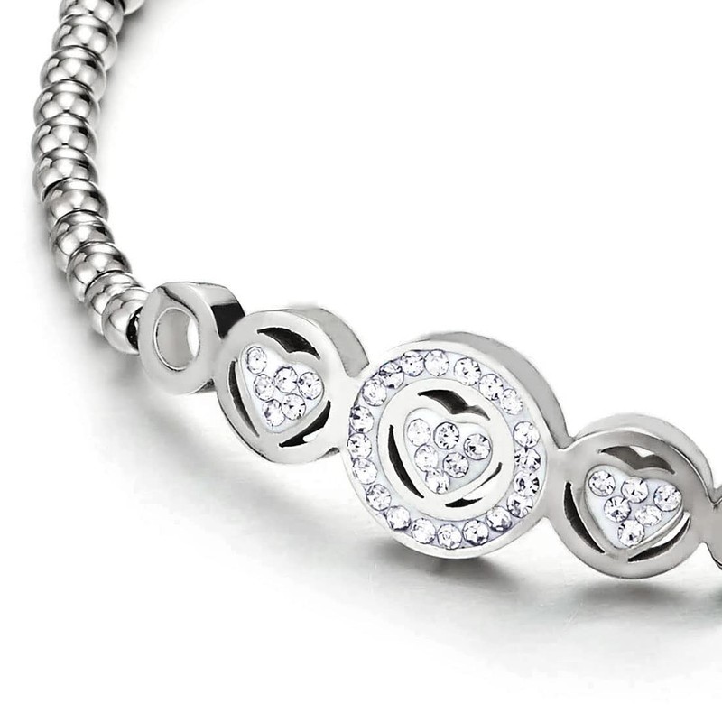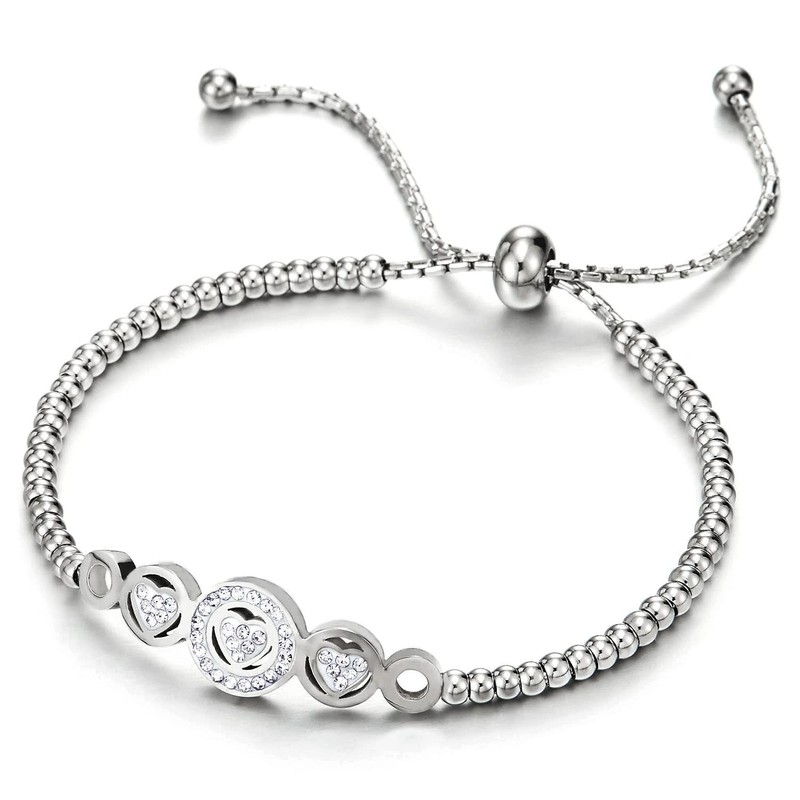 COOLSTEELANDBEYOND Stainless Steel Bead Bracelet with Cubic Zirconia Circle Heart Charm Adjustable, Stainless Steel, Cubic Zirconia