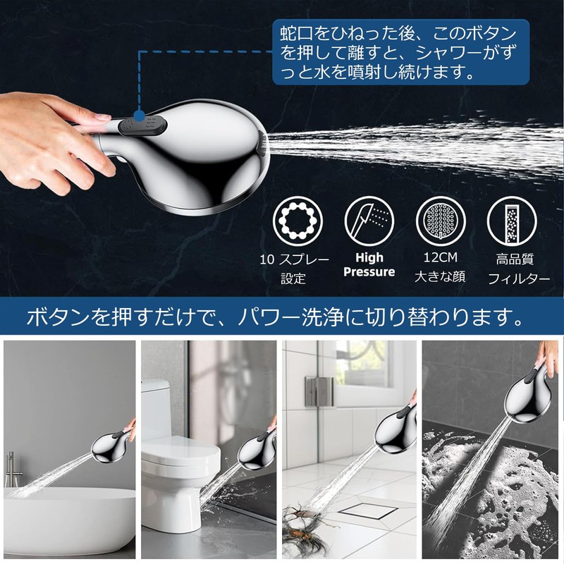 - 【独自の強力洗浄モード】:背面のボタンを押すだけで起動する強力な噴射洗浄モードを搭載したシャワーヘッドです。この機能により、トイレ、バスタブ、床、壁などの汚れを素早く簡単に掃除することができます。