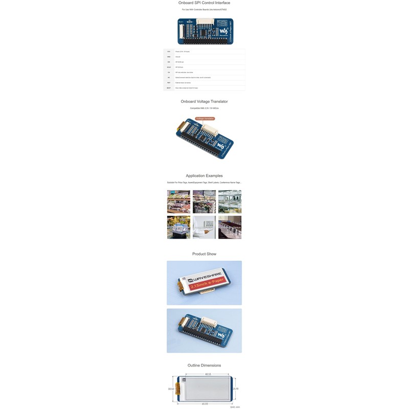 - 2.13 inch eink screen, with onboard voltage translator, compatible with 3.3V/5V MCUs