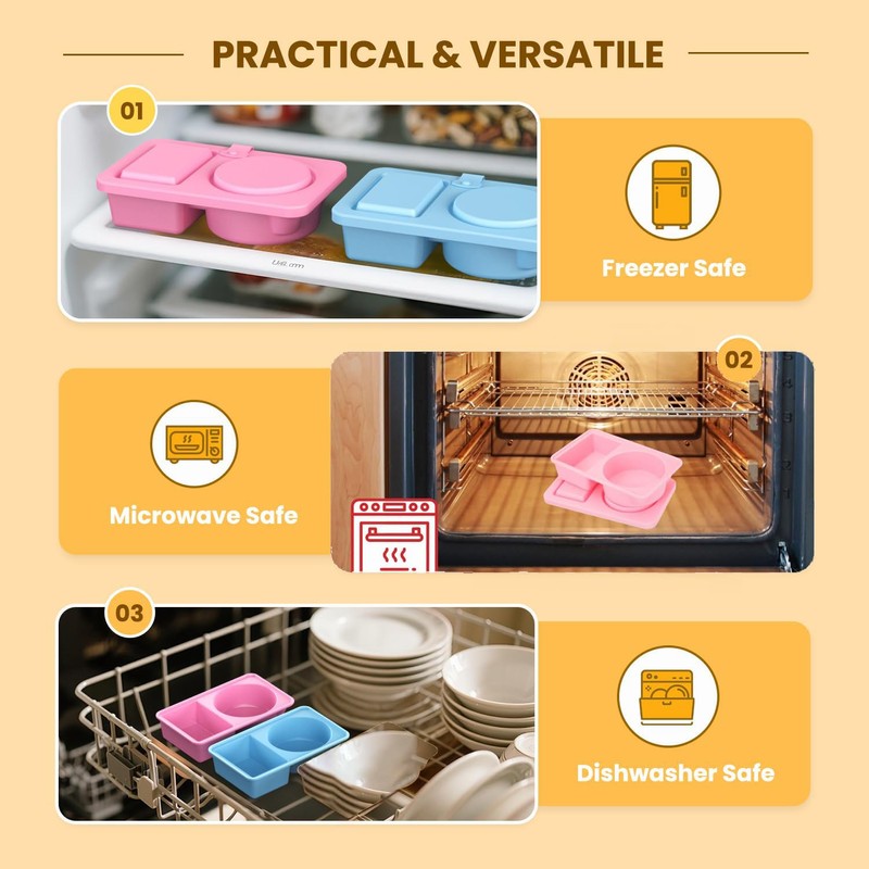 - 【Praktisch und leicht zu reinigen】: Diese snack box mit fächern sind mikrowellen-, spülmaschinen- und kühlschrankgeeignet und leicht zu reinigen. Das silikonmaterial ist schmutzabweisend, sodass die pflege zum kinderspiel wird. Ob sie sie von hand oder in der spülmaschine waschen, diese behälter sind langlebig und eine großartige ergänzung für ihre küchenutensiliensammlung.