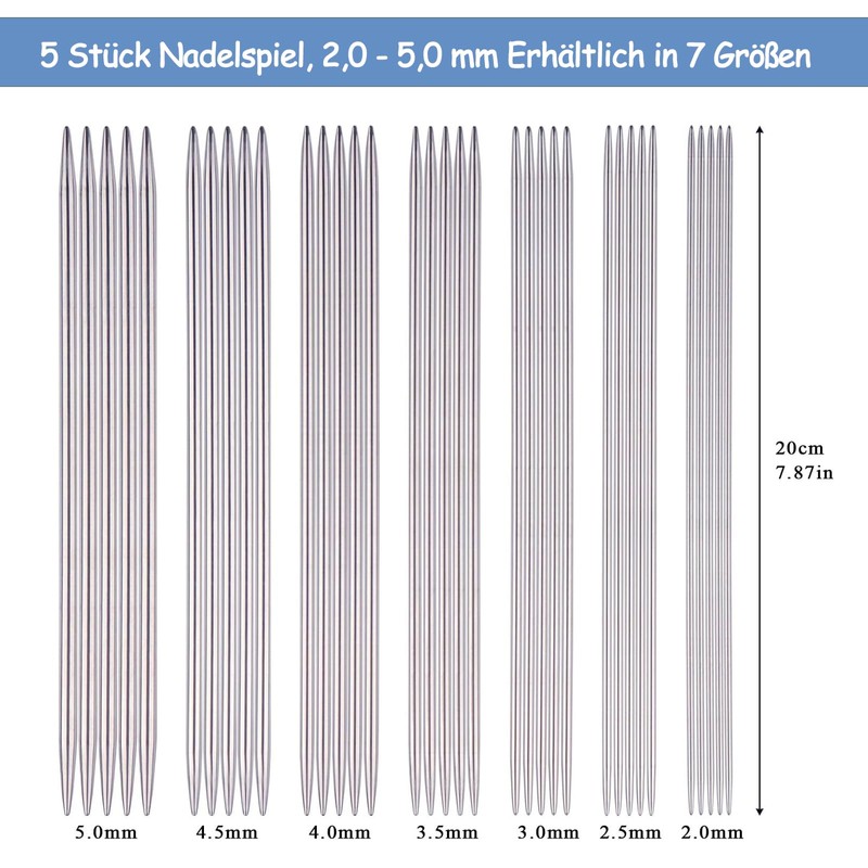 - [Available in multiple width variants] Each knitting needle set contains 5 knitting needles of the same size. The sizes are 2.0mm, 2.5mm, 3.0mm, 3.5mm, 4.0mm, 4.5mm, 5.0mm. These knitting needles are available in a variety of different width variations, so each knitter has the perfect width for their purposes