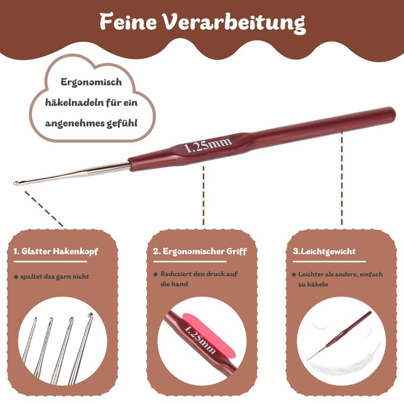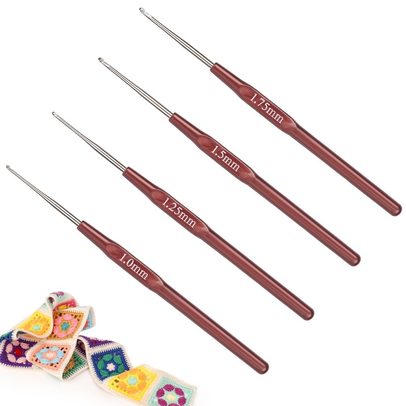 - Coffee mini crochet hook set: this compact crochet hook set contains a total of 4 sizes: 1.0 mm, 1.25 mm, 1.5 mm and 1.75 mm. Lightweight and durable, ideal for small crochet projects.
