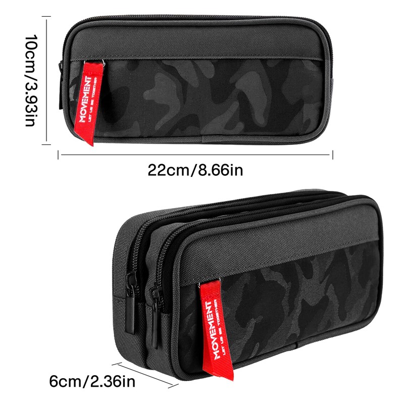 • Unique Design: Pencil case for boys with 3 compartments, provides large storage space for school stationeries and other accessories. It has a design camouflage pattern on the side for an attractive look and a red tab zip on the side bag for better grip.