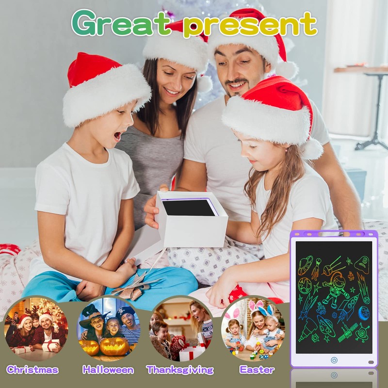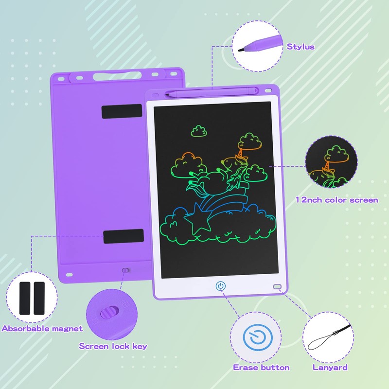 - đ Protect Kids' Eyes- This lcd writing tablet 12 inch adopts pressure-sensitive technology without radiation, no glare. The colorful screen of doodle board offers enough space for graffiti, free childâs imagination, provide a better preschool learning experience!