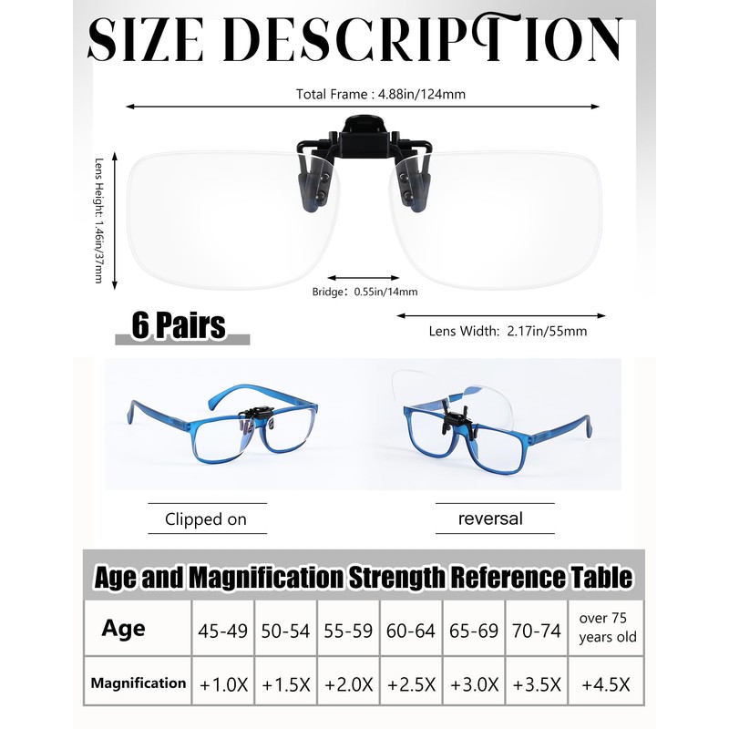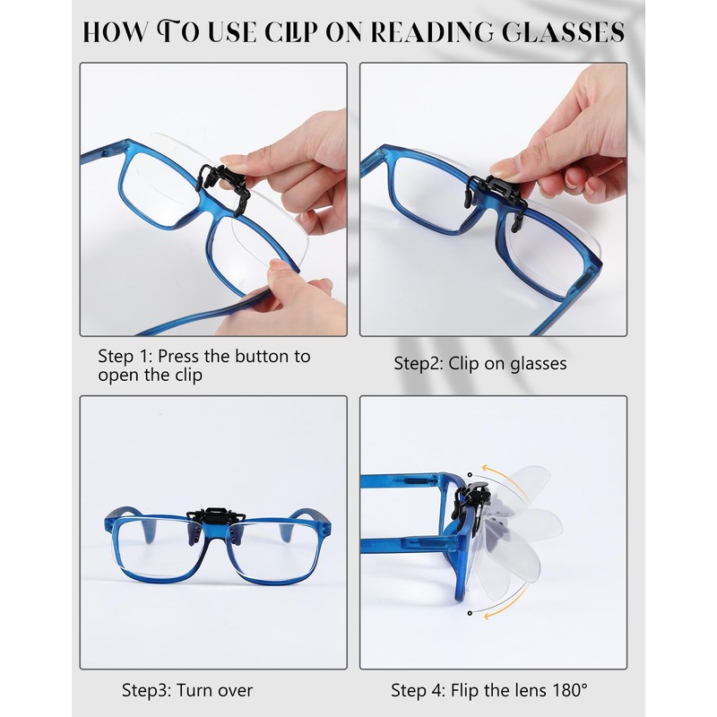 - Flexible Clip and Flip: reading glasses are designed with clips, convenient for you to clip them in your reading glasses and other ordinary glasses, non slip and stable; Just flip it up and down, you will enjoy different visions