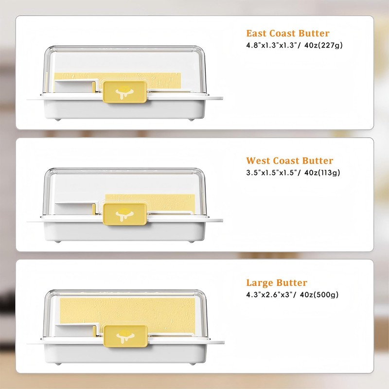 - Large Capacity: The butter keeper container with 7.28*4.33*2.67 inches, capacity of 500g butter is just right, it a must have for any kitchen or dining experience with its compatibility to store butter of different sizes, Its Large capacity makes it an excellent choice of most sizes for East/West coast butter. Butter dish has transparent lid allows you to easily see the contents while adding a touch of elegance to your counter top or dining table
