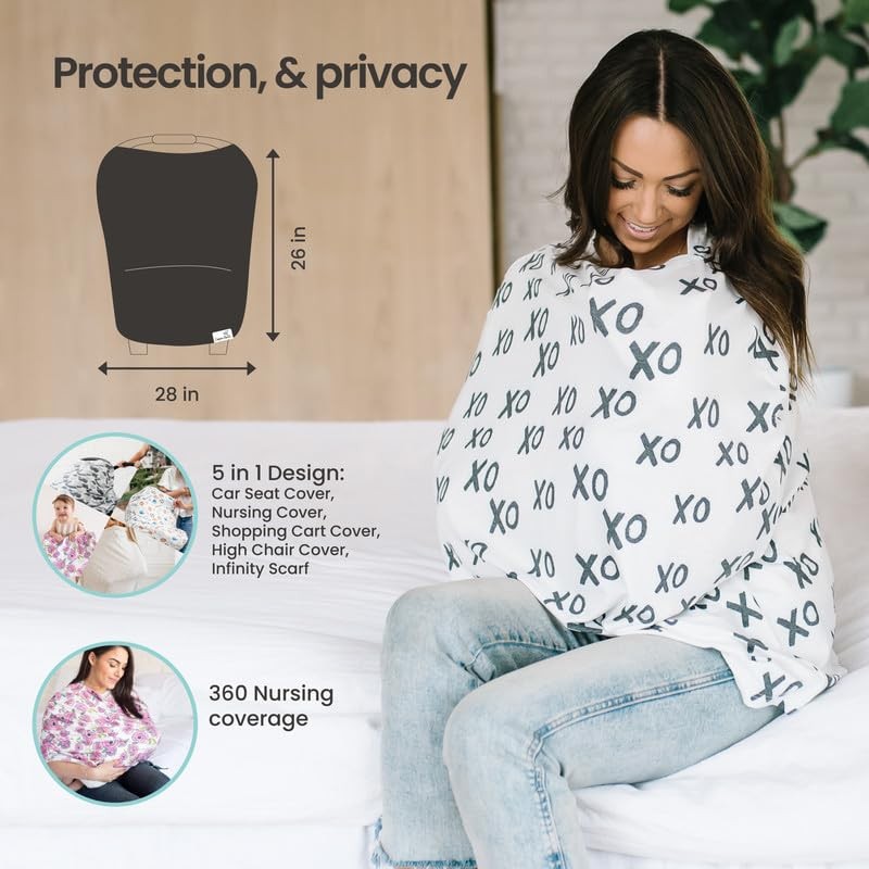 • Funda 5 en 1. Funda para asiento de coche de bebé. Funda de enfermería. Funda para carrito de compras. Funda para silla alta. Bufanda infinita. Tela elástica que se adapta a la mayoría de asientos de coche, carritos de compras y madres lactantes