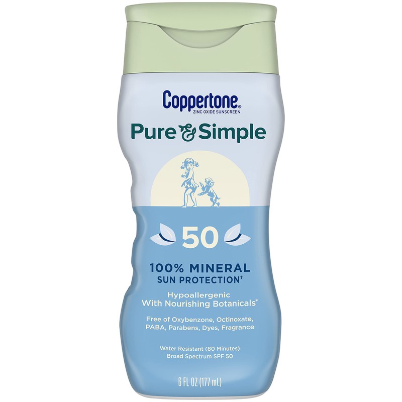 Protect even the most delicate skin from the sun with Coppertone Pure and Simple SPF 50 Sunscreen Lotion. This Broad Spectrum sunscreen with Zinc Oxide is hypoallergenic and gentle, and protects your skin during any outdoor activity. This Coppertone sunscreen lotion is made with 100% naturally sourced Zinc Oxide that protects your skin from the sun, plus nourishing extracts like tea leaf, sea kelp, and lotus. Coppertone Pure and Simple sunscreen is water resistant (80 minutes). This Coppertone sunscreen offers a tear free, SPF 50 sunscreen formula that is free of fragrance, dyes, parabens, PABA, alcohol, octinoxate and oxybenzone. This sunscreen SPF 50 is perfect for family fun in the sun. Voted the most trusted sunscreen brand(1), each sunscreen Coppertone creates follows a tradition of trusted, quality sun protection products. Use and reapply as directed. (1)Voted Most Trusted Sunscreen Brand by American Shoppers Based on the 2022 BrandSpark American Trust Study.