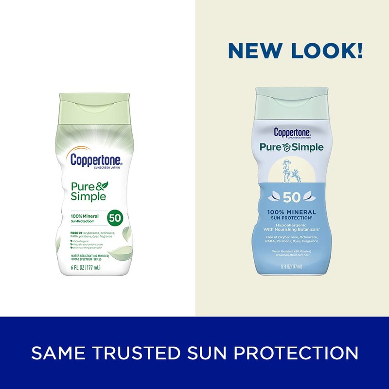 Coppertone Pure and Simple Zinc Oxide Mineral Sunscreen Lotion SPF 50, Body Sunscreen, Water Resistant, Broad Spectrum SPF 50 Sunscreen for Sensitive Skin, 6 Fl Oz Bottle