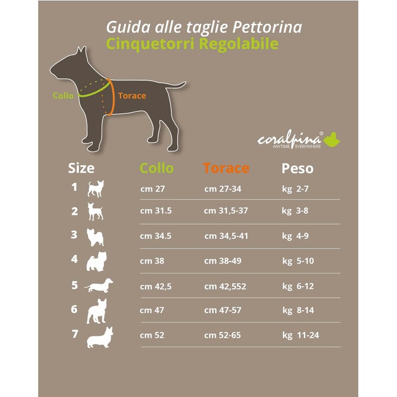 • The Cinquetorri adjustable chest strap is characterised by its versatile fit, specially designed for small and medium dogs. Its design aims for optimal comfort and breathability. The available colour palette offers options for every taste and with 7 different sizes (for dogs weighing 1 to 24 kg), you will find the perfect size for any four-legged friend