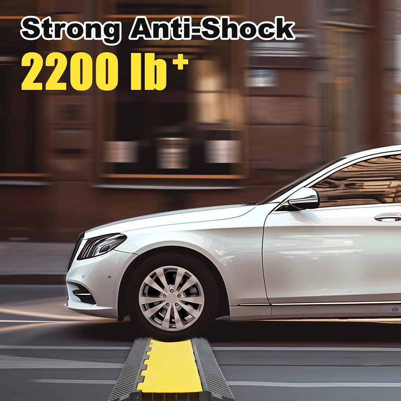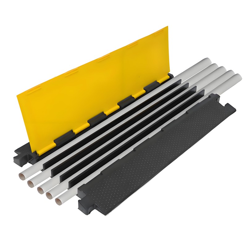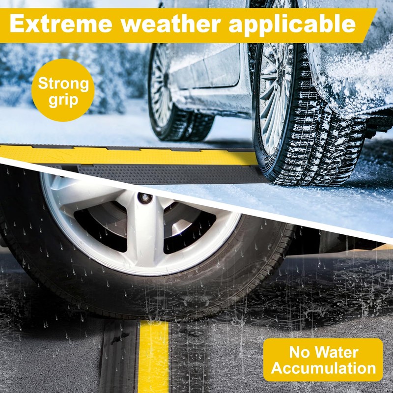 - High Visibility and Safety: Features a standard yellow and black color scheme for maximum visibility. The contrasting colors are highly noticeable, day or night, alerting drivers to slow down. The black part is made of high-load engineering rubber, while the yellow part is a PE cable cover, both resistant to pressure, and deformation. The grid design at the bottom enhances stability and pressure relief while facilitating water drainage, preventing road damage
