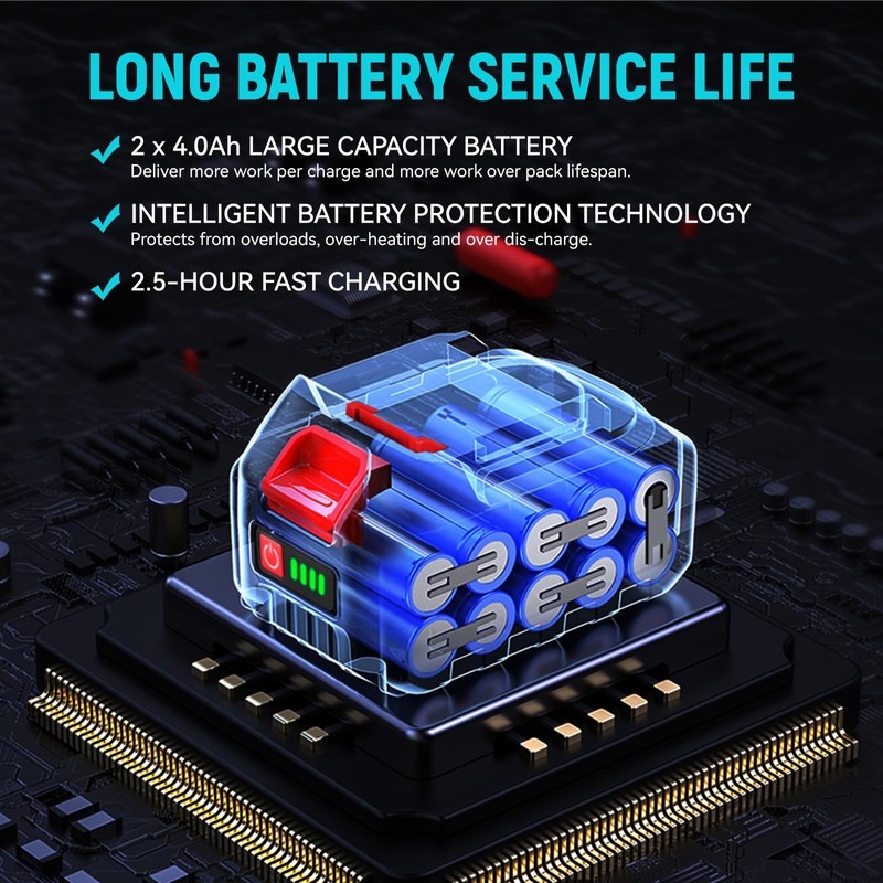 - 2 Pcs 21V 4.0AH Large Capacity Battery: The angle grinder is equipped with 2 pcs 4.0Ah batteries, you can work continuously for a long time without frequent interruptions for charging, which greatly improves your work efficiency.