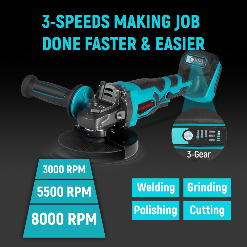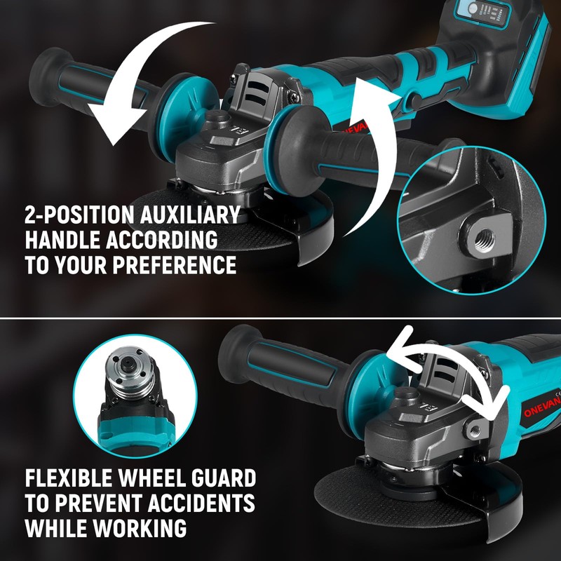 - Ergonomic Design: The cordless angle grinder has an ergonomic non-slip rubber side handle giving you added control and comfort for different angles and materials.