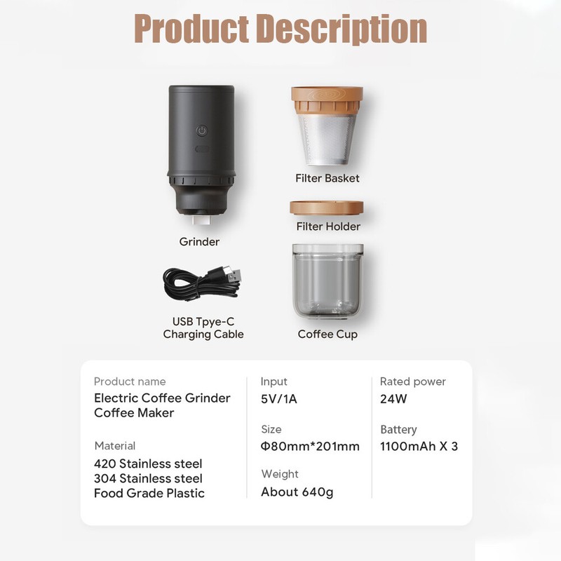USB Rechargeable: With a built-in 3*1100mAh lithium batteries, this coffee grinder can be charged via USB, making it convenient to use at home or on-the-go.