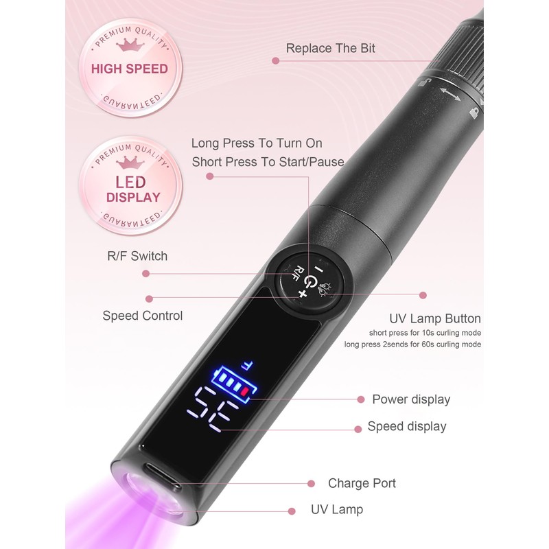 - 【Low Noise】This cordless nails file machine is with a powerful quiet motor. Also, the smart heat dissipation can avoid overheating efficiently. Professional high-tech speed bearing and motor, It makes this electric file low heat, and low vibration.