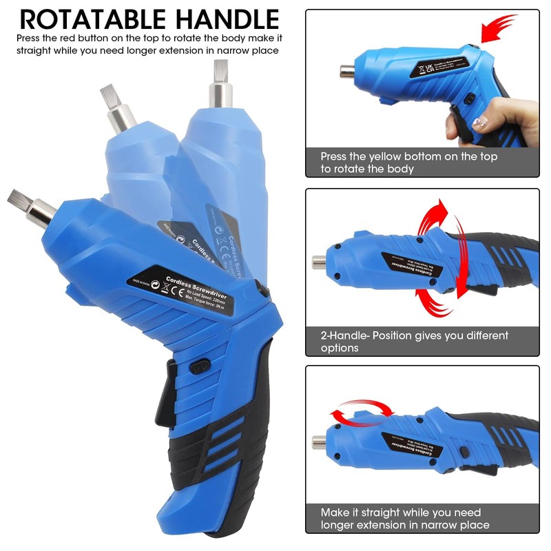 - 【90° Rotation Handle】①mini drill can be easily held with one hand for quick operation. one hand and press the button at the top of the turn with your thumb, and rotate to make it straight with the other hand. This small drill Ideal for screwing into narrow spaces and blind holes. This electric screwdriver is flexible for tight and tough-to-reach places task. ② Forward/Reverse button allowing the screwdriver to rotate between clockwise (forward) and counter-clockwise (reverse).