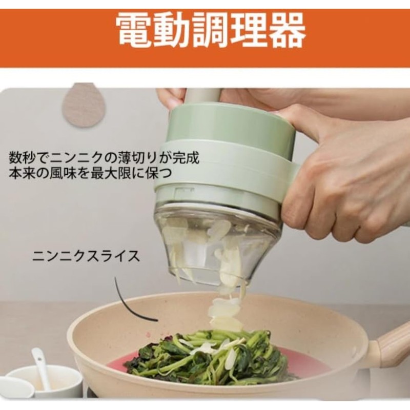 - Electric Slicer: Instantly slices leions and cucumbers. Even small ingredients like garlic can be pressed into the pushing bar to safely slice the garlic. Reduces prep and finish cooking time for a variety of food preparations such as noodle, fried rice, potato salad, etc