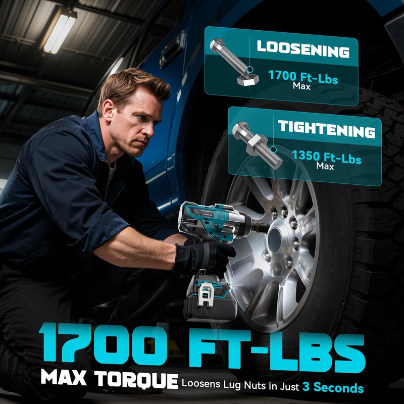 - 1700 FT-LBS High Torque Impact Wrench: Cordless impact wrench 1/2 inch packs a powerful 1350 ft-lbs tightening torque and 1700 ft-lbs loosening torque. Designed to make tough jobs easy, it’s perfect for removing stubborn bolts, changing car tires, or handling heavy-duty projects at home or on the job.