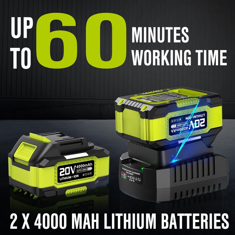 - Longer Battery Runtime - Say goodbye to the cord limitations and bulky noise of traditional leaf blower. Upgrade to the EWORK battery-operated leaf blower. Equipped with a fast charger and 2 x 4.0Ah 20V batteries, it offers 60 minutes of low-speed mode and 30 minutes of high-speed mode, ensuring uninterrupted yard work efficiency, Ideal for medium to large yards