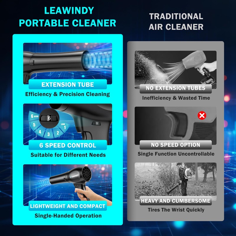 - ✅【6-Speed Smart Control】 Cordless leaf blower features six precision speed settings for complete versatility. Use speeds 1-2 for indoor dusting on delicate surfaces like cars and workbenches. Speeds 3-4 efficiently clear patios and light debris. Engage turbo speeds 5-6 to blast leaves and stubborn dirt from driveways. The adjustable airflow makes this blowers for lawn care an ideal choice for all cleaning scenarios.