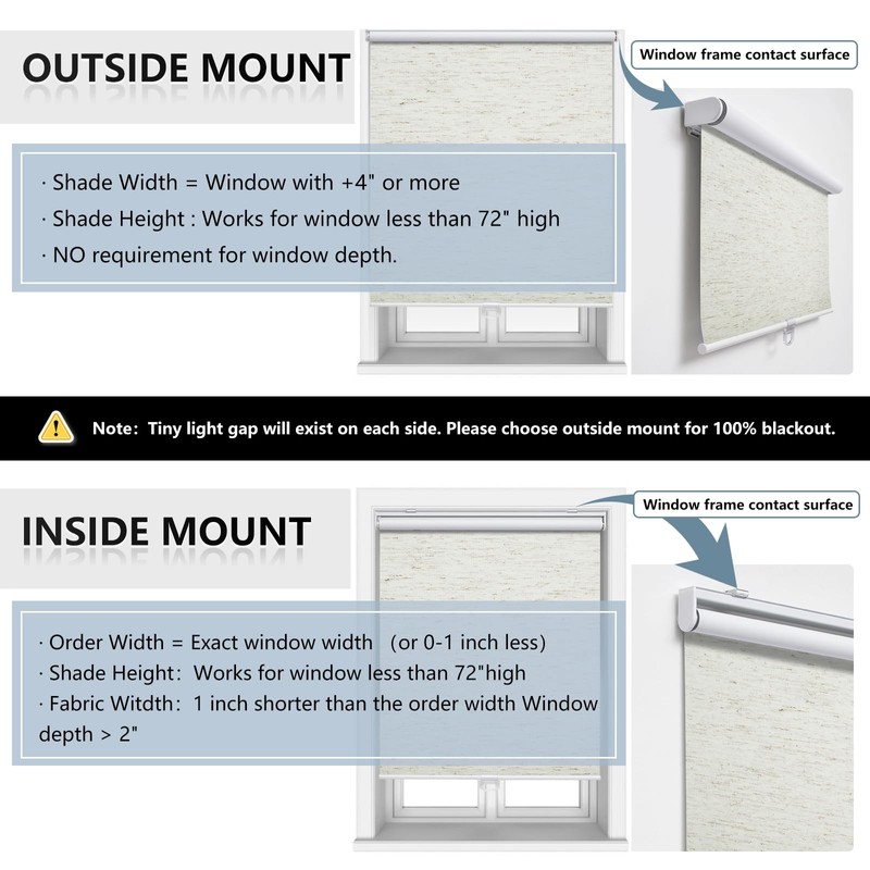 - 【How to choose right size】:To make sure to cover the entire window, outside mount shades need to be 4 inches wider than windows wide. If your windows width is 30", order size 34" would be okay for outside mount;If your windows are 30" wide, order 30" or slightly less for internal installation. Don't worry window blinds height,it can adjust from 0" to 72". (Pls Note):Fabric width will be 1" narrower than the size of the shade.