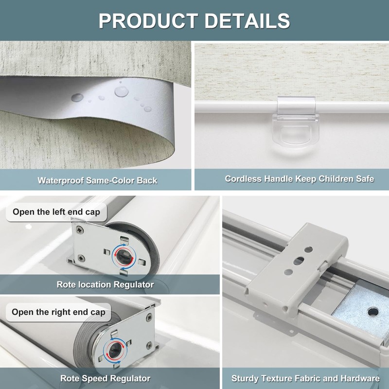 - 【New Innovative Design】: The cordless design is safer for kids and pets. The cordless roller blinds are more convenient than corded roller blinds. Built-in the robust spring-loaded mechanism, which has passed 5,000 times usual lifting or pulling down tests for each blind, You can stop the shade wherever you want smoothly. Open the roller blind, pull it to the place; Shut the roller blind, you can gently pull the buckle, and the roller blind would automatically close.