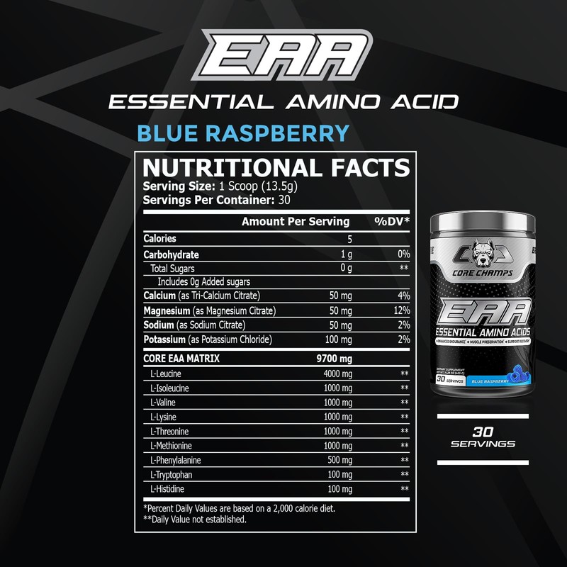 Core Champs EAA Powder | Essential Amino Acids for Enhanced Endurance & Recovery | All 9 Vital Aminos | 9.7g Core EAA Matrix | 30 Servings (Blue Raspberry)