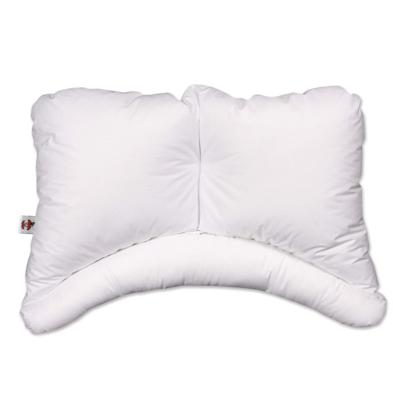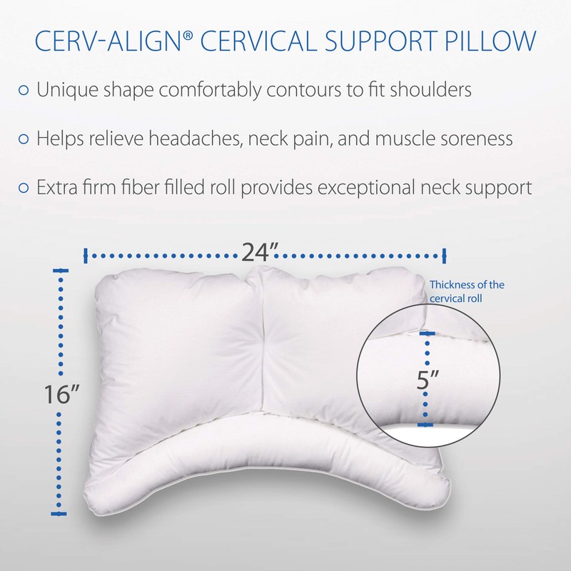 The Cerv-Align FIRM Cervical Support Pillow has both the firm support of an orthopedic pillow, and the comfort of a traditional sleeping pillow. Designed to help relieve headaches, neck pain, and muscle soreness, this pillow is commonly used to help manage a variety of conditions affecting the neck and shoulders. While back sleeping, the extra firm fiber filled neck lobe contours to fit the shoulders and provides even support across the shoulder line while the conventional pillow area comfortably supports the head. For side sleepers or those who prefer the comfort of a traditional fiber or feather pillow, simply rotate the support lobe away from the neck. The fiber filled area gently cradles the head with down-like comfort and can be used to adjust to sleeping on the firm cervical lobe. It may take some time to adjust to this cervical pillow and immediate overuse may increase neck pain. Those who slowly ease their way into orthopedic correction by alternating between this pillow and their current pillow achieve the best results. Select from three different lobe sizes for a custom fit. Covered with high quality cotton fabric for maximum comfort and durability. The Cerv-Align's exclusive fitting system ensures a proper fit for any body type. Fits a standard pillowcase. Made in the USA and contains no latex.