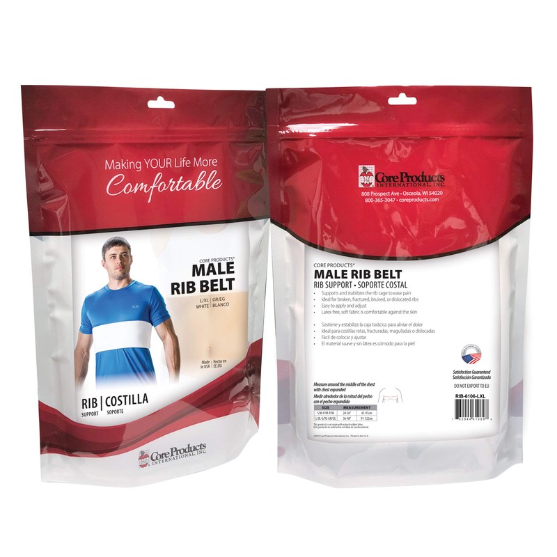 The Male Rib Belt supports and stabilizes the rib cage to help lessen the pain of everyday movements and promote healing after sternum or rib injury. This support is ideal for broken, fractured, bruised, or dislocated ribs. The latex-free elastic material is soft and comfortable against the skin. The two- tiered elastic material limits chest expansion and helps prevent the support from rolling. The plush hook and loop material can be easily adjusted, providing compression ranging from gentle to firm, as needed for comfort. Soft elastic CorEdge finish on top and bottom edges offers added comfort and flexibility. Low profile, flexible design, moves with you during normal daily activities and is discreet under clothing. Made in USA.