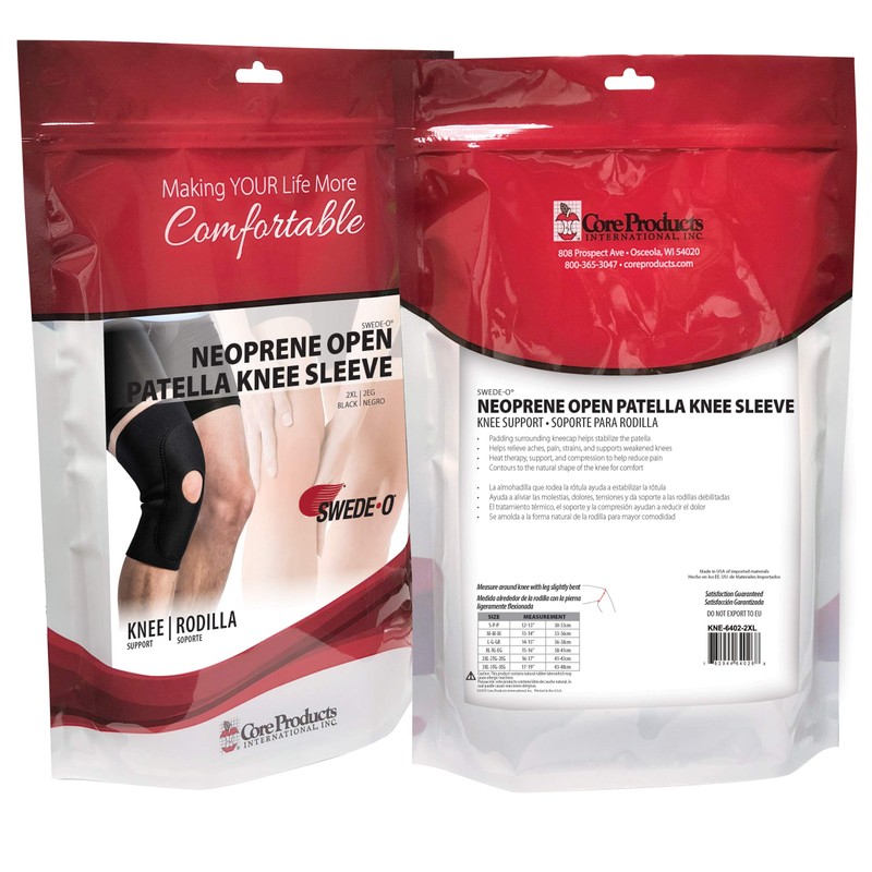 The Core Products Neoprene Open Patella Knee Sleeve is a convenient slip-on support to help relieve aches, pains, strains, and weakened knees. High quality neoprene provides gentle compression and warmth to help reduce pain and promote recovery. The open patella design reduces pressure which may cause or aggravate knee injuries. The support's double padding provides targeted compression to help stabilize the patella. Contoured, bilateral design fits the right or left knee. The material is soft and comfortable against the skin. Size is based on the length around your knee. Made in the USA.