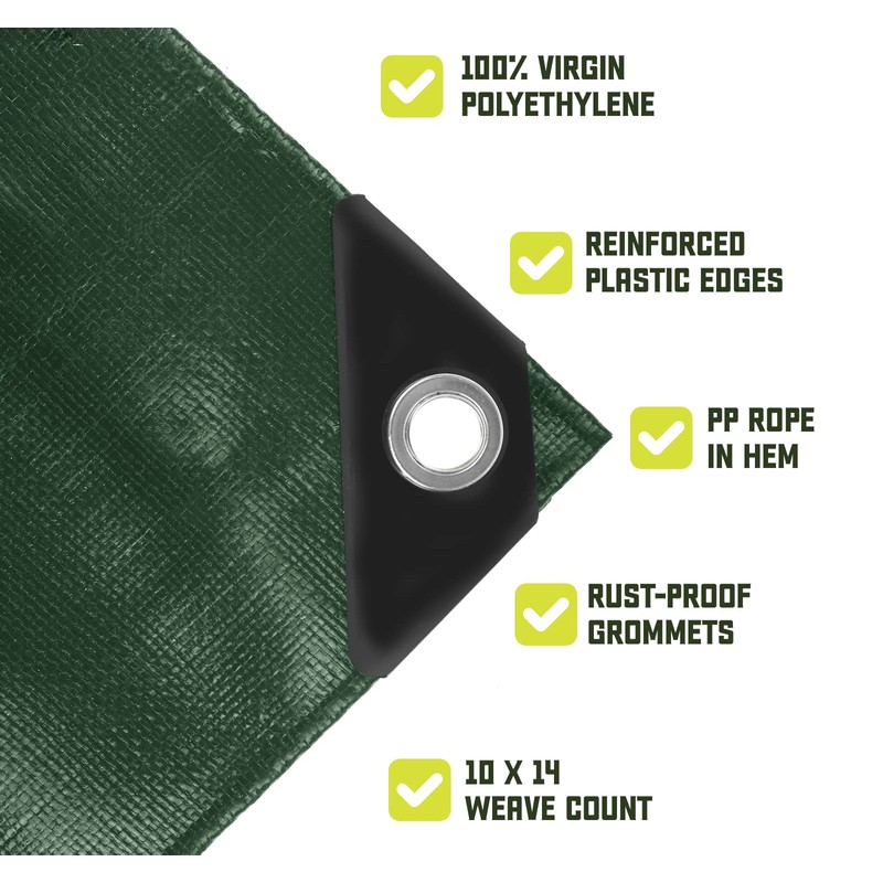 - STRONG GROMMETS & REINFORCED EDGES: The protective tarp has a 10 x 14 weave count, reinforced edges and metal grommets every 24 inches. The tear-resistant material is super durable while the metal grommets allow you to tie down the tarpaulin cover easily, using bungee cords or a strong rope.