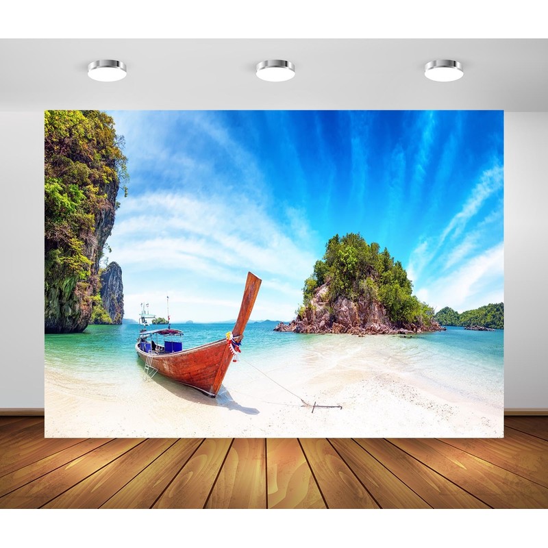 CORFOTO 7x5ft Fabric Thailand Paradise Beach Backdrop Traditional Longtail Boats Parked Seaside Landscape Photography Background Blue Sky Summer Travel Portrait Photo Booth