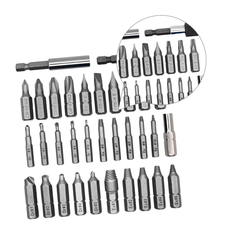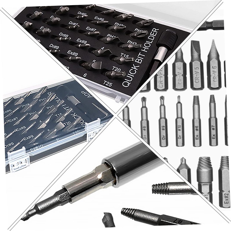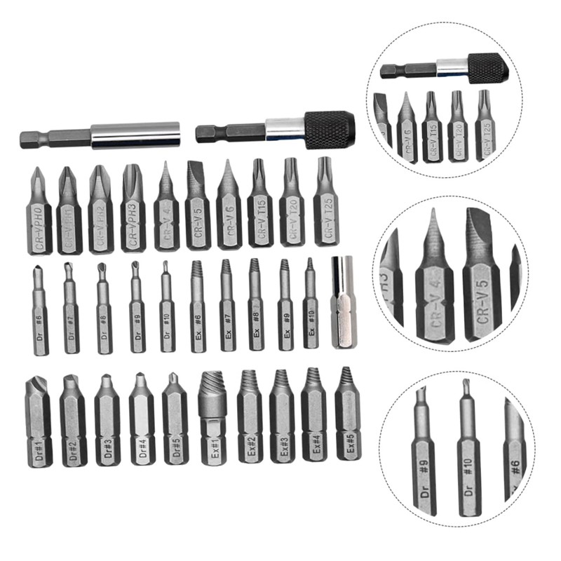- Bolt Extractor Tool Kit: Includes 10pcs counter-drill bits (Dr#1-Dr#10), 10pcs extractors (Ex#1-Ex#10), 10pcs bits (PH0, PH1, PH2, , 4mm, 5mm, 6mm, T15, T20, T25), 1pc quick release extension rod, 1pc common extension rod and 1pc rod.