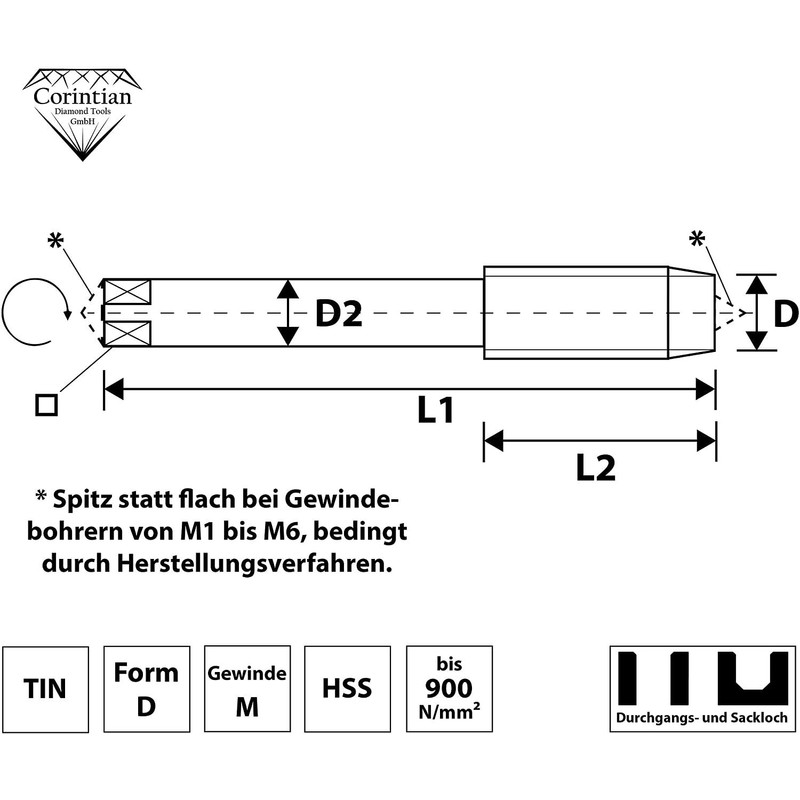 - Technical details: Form C, metric standard thread (M), flank angle 60°, TiN coating, spiral groove 35°, for blind hole and internal threads.