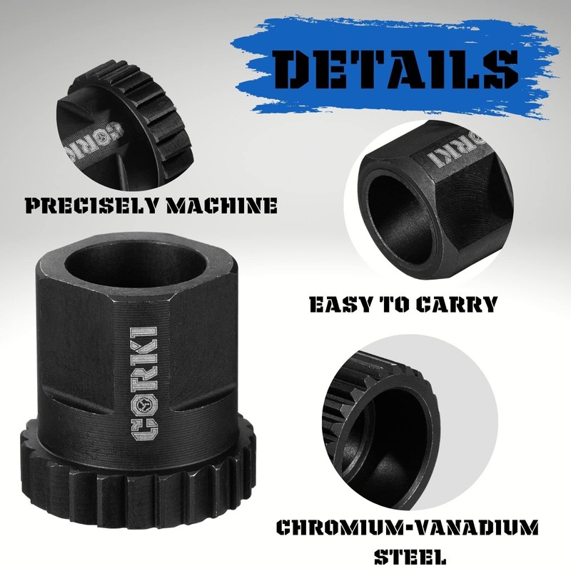 • CHROME VANADIUM STEEL The bike hub nut of your bike is very important. With a correct bicycle hub locking ring means more fantastic driving performance. The corki Cycles bicycle wheel disassembly tool is made of high quality chrome vanadium steel, which has been hardened by vacuum hardening and heat treatment, with solid hardness. So you don't need to worry about the wheel removal tool fading or turning black.