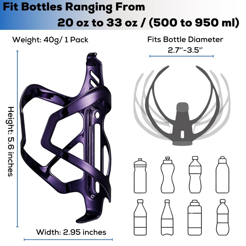 - Fits Most Standard Bottles: Aluminum bike bottle holder are designed to be compatible with a wide range of standard bottles. Specifically, they can easily accommodate bottles ranging from 20 to 33 ounces (500 to 950 ml), including popular sizes like 21, 24, and 25 ounces.