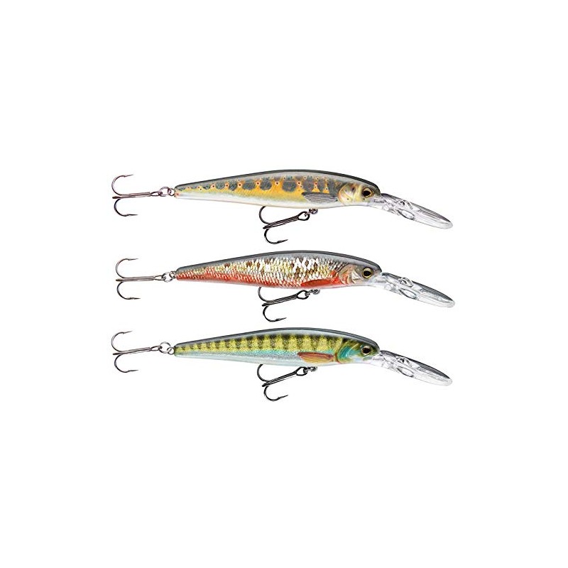 3 identical floating deep diving wobblers with an average diving depth of approx. 3.0 m in 3 different Realfish designs: injured white fish brown trout and perch. Universal fishing wobblers especially for standing waters and all larger predatory fish such as zander and especially pike.