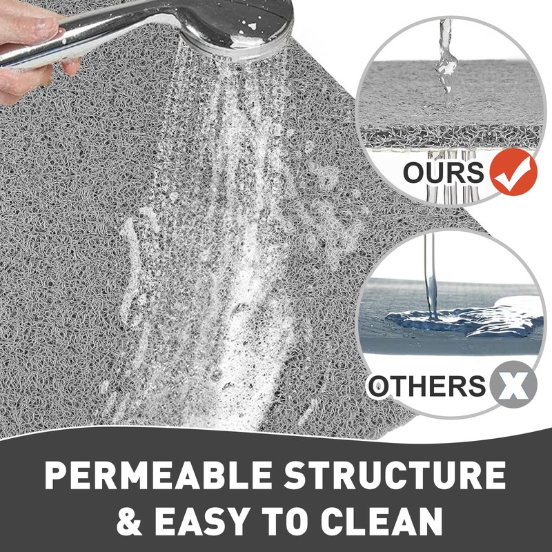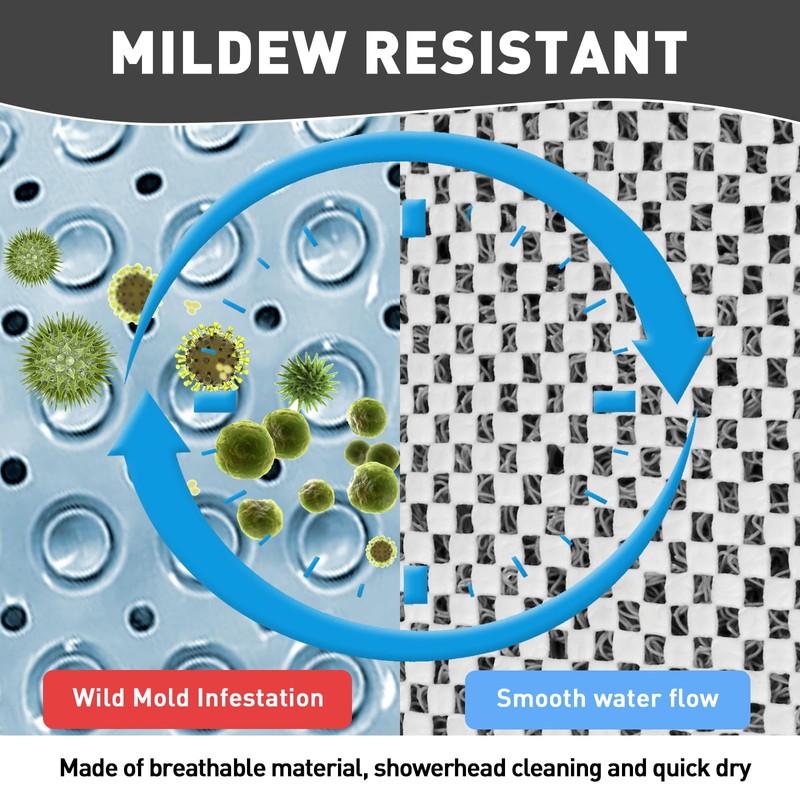 • 🚿【Outstanding Draining】No matter where the drain hole is, natural hundreds drainage holes, a looped surface and a lattice layer work together to encourage water to flow through the shower mat non slip anti mould. No more worries about water blockage and mildew.