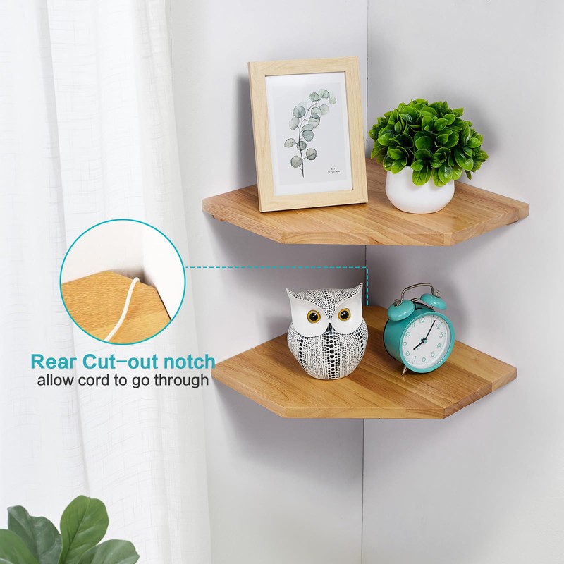 Corner Wall Shelves, Corner Floating Shelves Set of 2 Solid Oak Wood Display Shelf with Wire Hole Small Plant for Kitchen Living Room