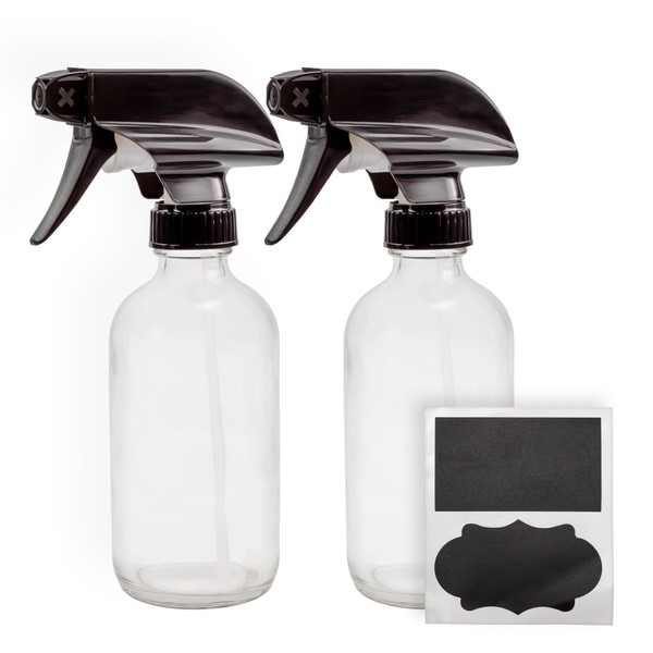 Cornucopia Brands 8-Ounce Clear Glass Spray Bottles (2-Pack); Boston Round Bottles w/ 3-Setting Adjustable Black Heavy Duty Sprayers & Chalk Labels | Cornucopia Brands