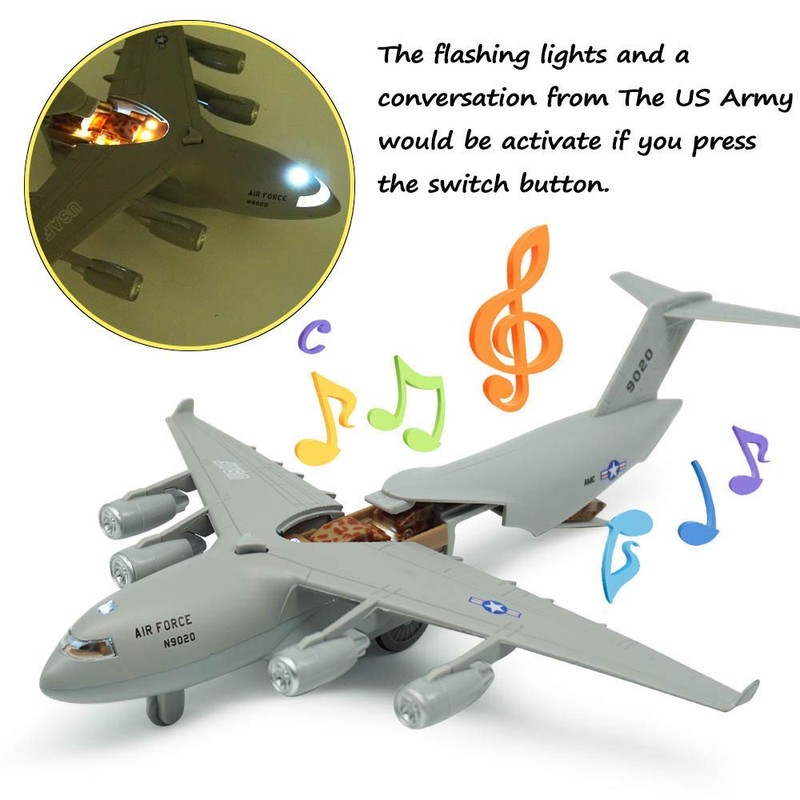 - ✈ Cool Plane Toy: Press the switch button on the body, the engine room will open with voice and the light will flashing. You will hear a person as if he was talking to you.