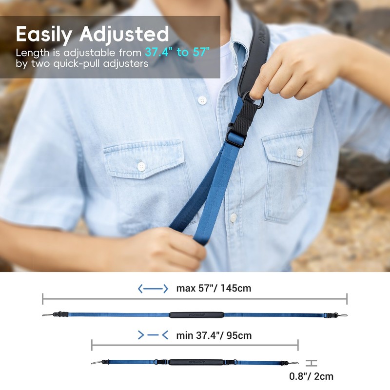 • Fácil ajuste: la correa ofrece un rango de ajuste de longitud de 95 cm a 145 cm. Los anillos en D de ajuste integrados en ambos lados permiten cambiar rápidamente la longitud mientras están en uso.