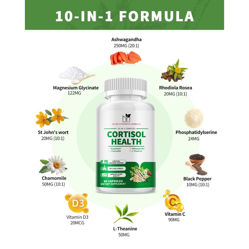 Our carefully crafted formula includes Vitamin C, Vitamin D3, and Magnesium Glycinate, working together to support natural cortisol regulation and promote overall health.