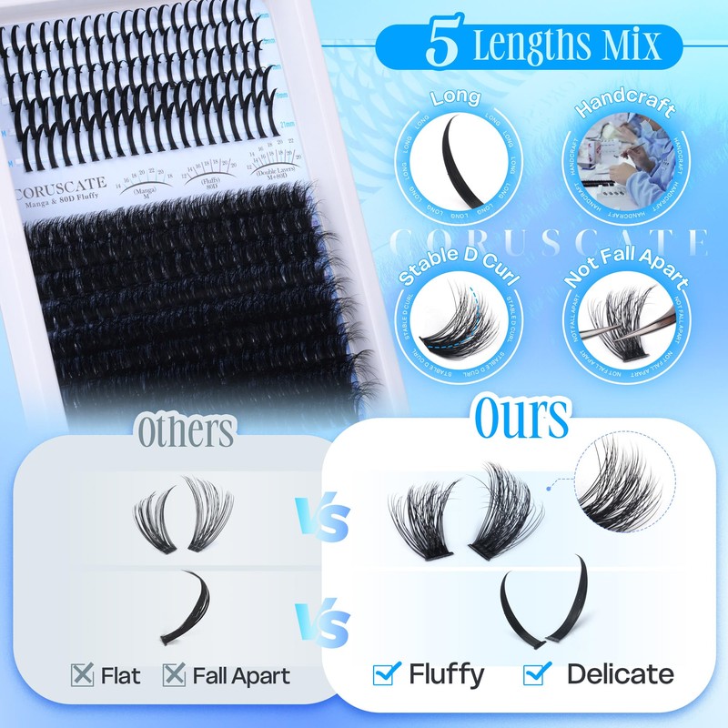 - FLUFFY SPIKE EYELASH CLUSTERS: Beauty requires fluffy and spike lash clusters, so why not combine the two lash styles we designed for this—a 80D fluffy volume lash plus a manga lash? Cluster eyelash extensions give you an eye catching dramatic look, highlight your makeup, and keep you looking amazing all day; individual eyelashes are ideal for those who desire thick fluffy lash extension and a mega style; Fluffy cluster lashes with D curl shape offering dramatic volume and spiky Russian-style appearance for a bold eye look