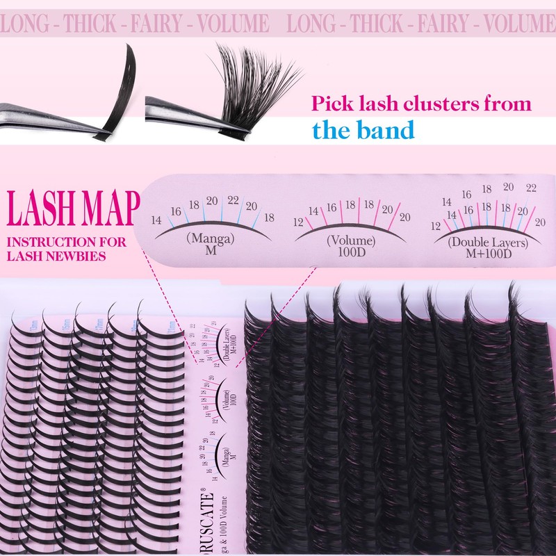 - SPIKE EYELASH CLUSTERS AND VOLUME: Beauty requires wispy volume and spike lash clusters, so why not combine the two lash styles we designed for this kit—a 100D volume lash and a manga lash? Cluster eyelash extensions give you an eye catching dramatic look, highlight your makeup, and keep you looking amazing all day. They are ideal for those who desire thick lash extension and a mega style; Experience the dramatic volume and length with these 100D lash clusters, featuring 13-21mm long manga-inspired lash fans