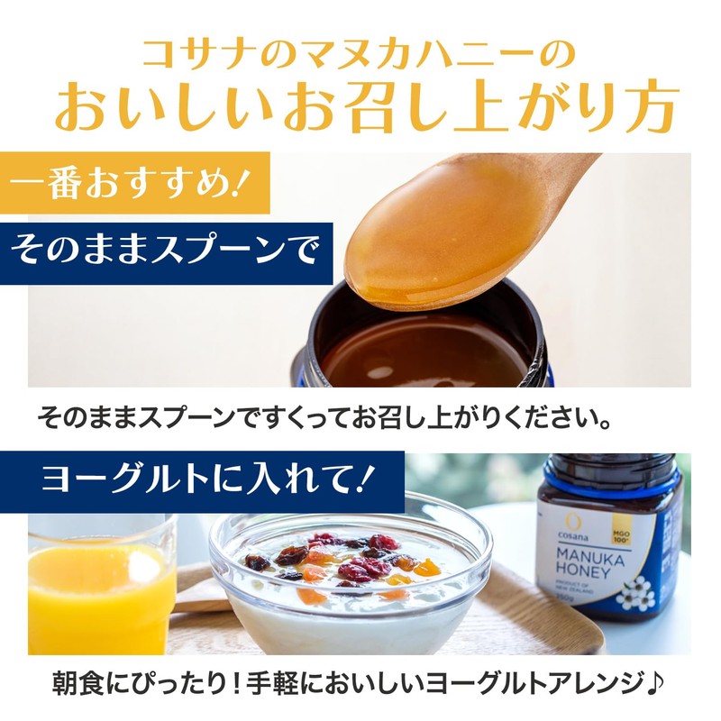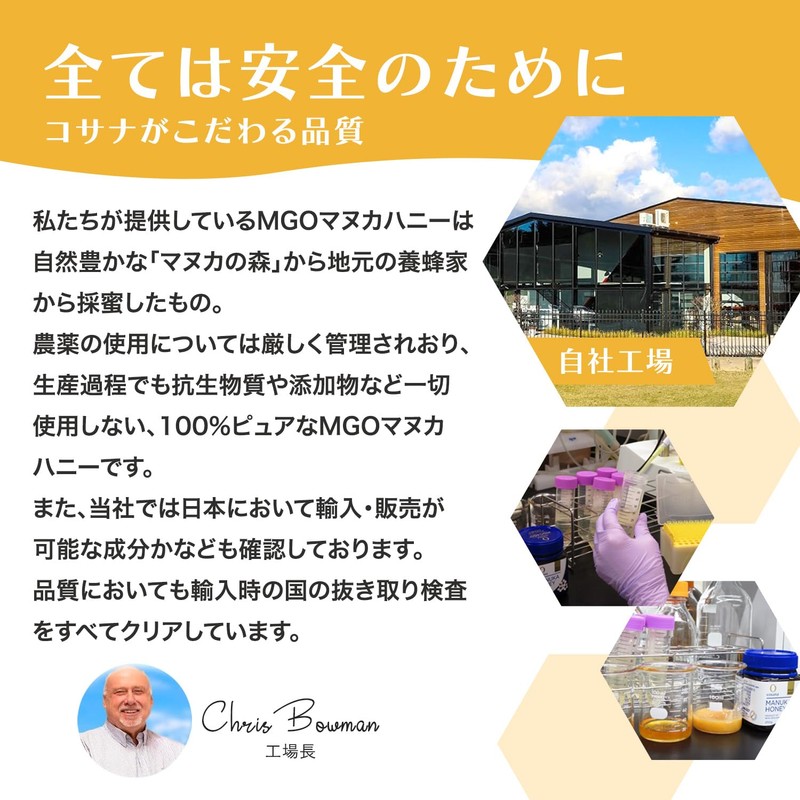 - 本品は、cosanaのニュージーランド現地法人であるCOSANA NEW ZEALAND LIMETEDが製造しています。厳しい検査(農薬分析、抗生物質、添加物未検出等)はもちろんこと、ニュージーランド政府機関であるMPIの基準をクリアしたMGOマヌカハニーです。加えて日本国内で全数外観検品と抜き取りでMGOの再分析を実施しダブルチェックする事で厳格な品質管理を行っています